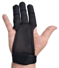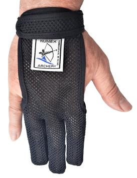 Schwarzer Sommer Schießhandschuhe für Bogensport aus belüftetem Textilnetz von Numex Archery mit verstärkten Fingerspitzen. Handschuhe für Bogenschützen mit durchgehender Handfläche, robusten Cordura-Fingerspitzen und verstellbarer Handschlaufe. Schützt die Fingerspitzen vor Sehnenschnitten und sorgt für eine gute Belüftung, um im Sommer das Schwitzen der Hände zu verhindern.