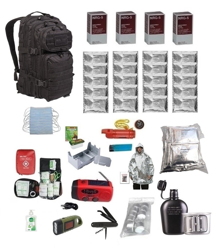 Modern noodpakket uitgebreid genoeg om 72 uur of 3 dagen te overleven en licht genoeg om door senioren, dames en kinderen gedragen te kunnen worden.
